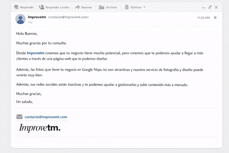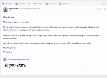 Recibirás un correo como este de nuestro equipo analizando los puntos débiles de tu negocio, ofreciéndote y recomendándote las mejores opciones que más te ayudarán a mejorar tu imagen digital. Consigue ya tu asesoría gratuita sin compromiso.